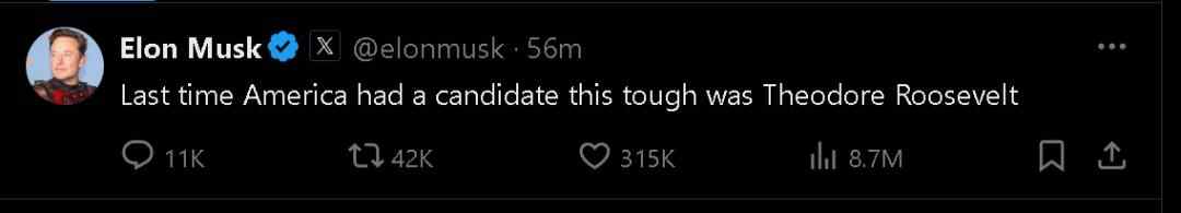 在第三则帖文中,马斯克说上一次美国出现这么坚韧的总统,还是百年前的西奥多·罗斯福。