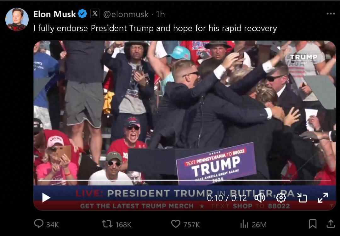 在第一则帖文中,马斯克表示自己将毫无保留地为特朗普的竞选背书站台,并希望特朗普能早日康复。