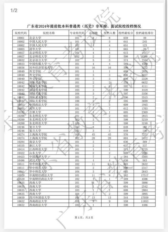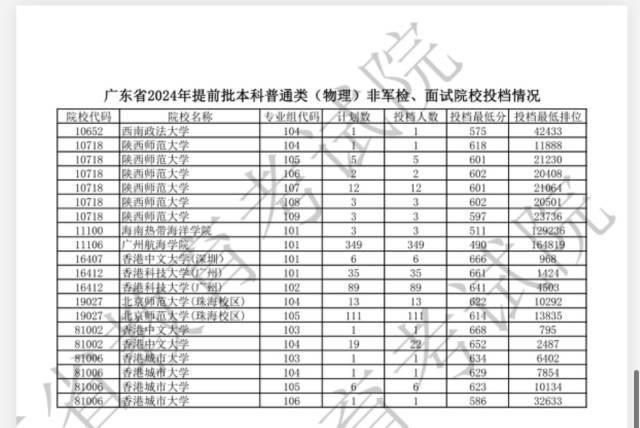 3.中央司法警官学院。高考成绩达到广东省2024年普通高校招生本科院校录取最低分数线[普通类(历史):总分428分;普通类(物理):总分442分],政审、体检、面试合格且未被录取的考生。
