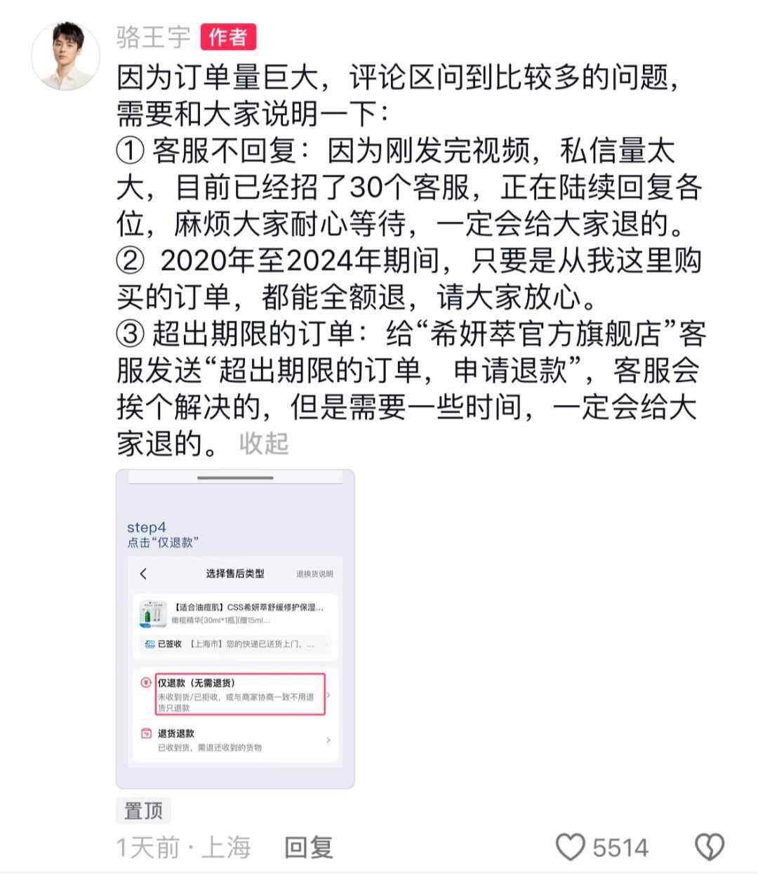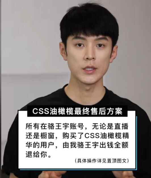 “所有在骆王宇账号,无论是直播还是橱窗,购买了CSS油橄榄精华的用户,由我骆王宇出钱全额退给你。”