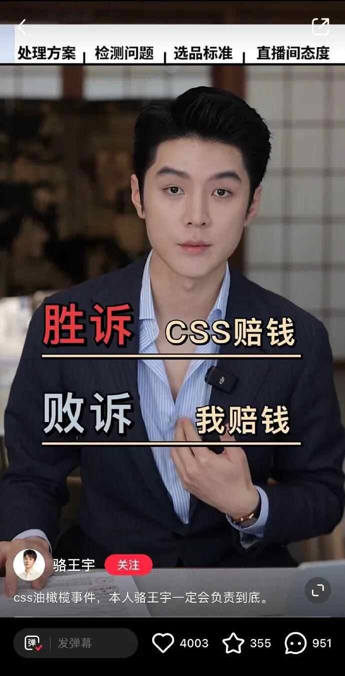 带货过相关产品的骆王宇也陷入“CSS油橄榄精华”事件风波,当时骆王宇也在直播时回应了此事,并于25日发布澄清视频(现已删除)。