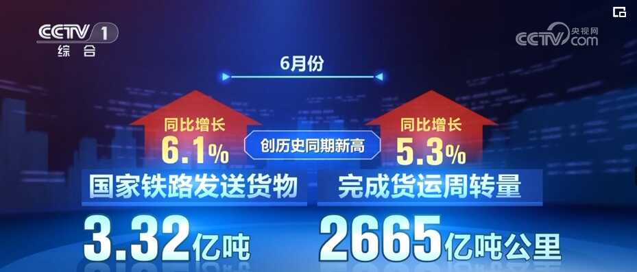 央视网消息:记者7月14日从国铁集团获悉,6月份,国家铁路发送货物3.32亿吨,完成货运周转量2665亿吨公里,同比分别增长6.1%、5.3%,创历史同期新高。