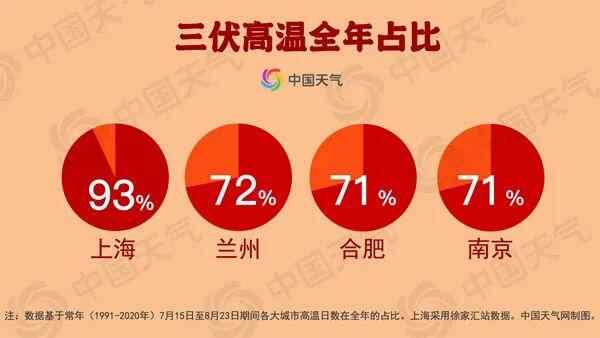 对于不少地方来说,“三伏”也是一年中高温最集中的时段,例如上海徐家汇,全年中有九成以上的高温日出现在“三伏”期间,南京和合肥也有七成以上的高温日集中在“三伏”。