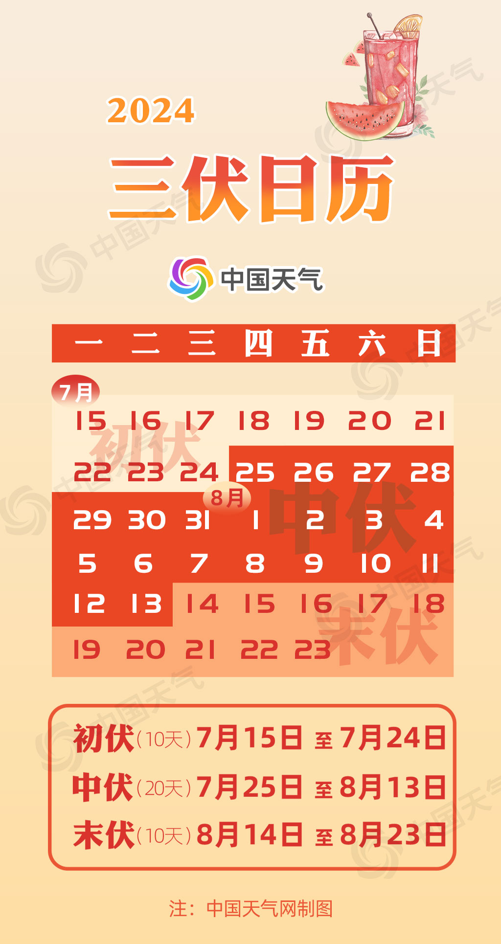 在大家的印象里“三伏天”一般是30天时间,但其实,“三伏”也有“加长版”的40天。“三伏”是按农历计算,每年夏至后的第三个庚日(干支纪日法中带“庚”的日子称为“庚日”)为“入伏”,立秋后的第二个庚日为“出伏”。“头伏”和“末伏”的长度是固定的,均为10天。“中伏”长度则由立秋节气与其后首个庚日之间的间隔决定,可能是10天,也可能是20天。今年“三伏”7月15日入伏,8月23日出伏,共计40天。