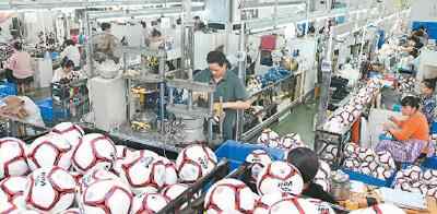 湖南省邵阳市洞口县工业园区,金美达体育用品有限公司员工在生产足球,赶制出口订单产品。滕治中摄(人民视觉)