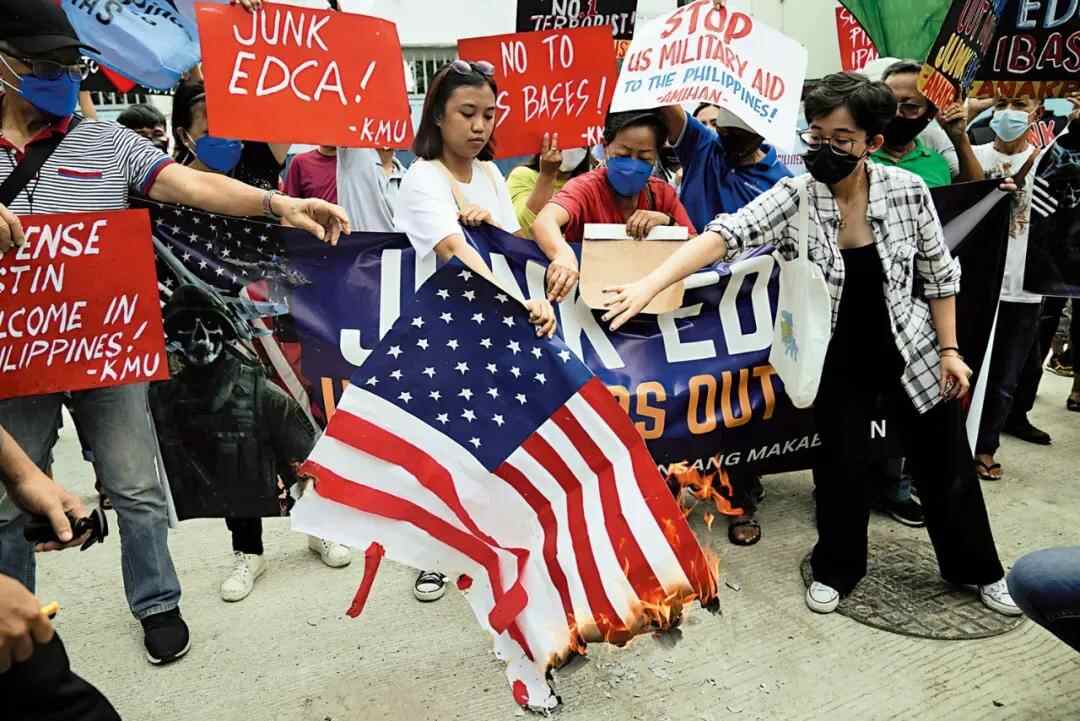2023年2月,菲律宾民众在马尼拉焚烧美国国旗,标语上写着“垃圾美菲《加强防务合作协议》”“不要军事基地”“停止美国军事援助”。