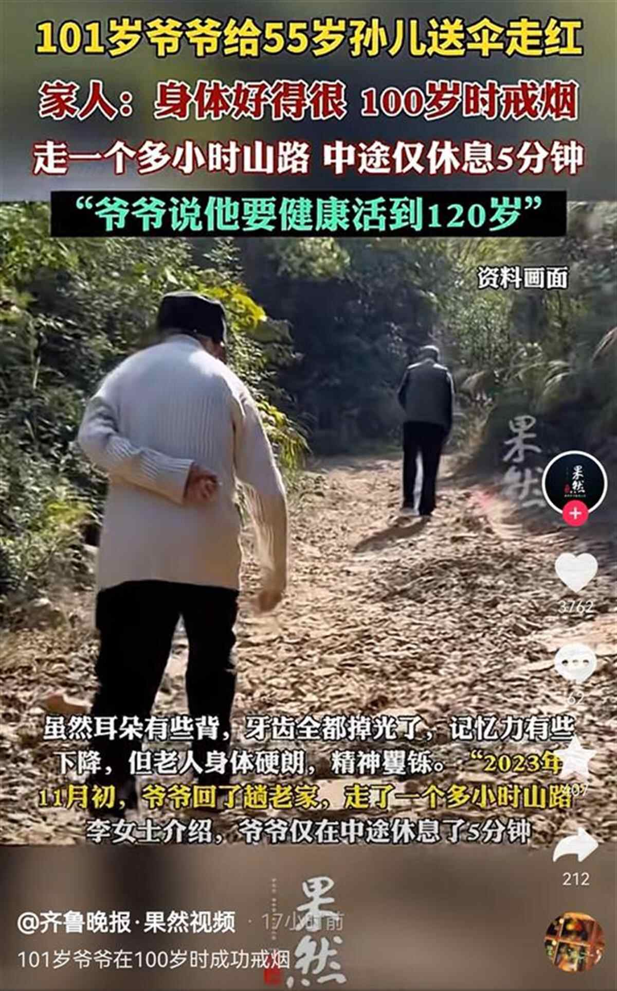 近日,四川一位101岁的爷爷给55岁的孙儿送伞迅速走红。网友既感动又羡慕,有人留言说:“50多岁的孙儿还有爷爷疼,好幸福哦。”
