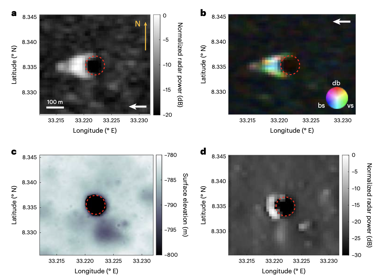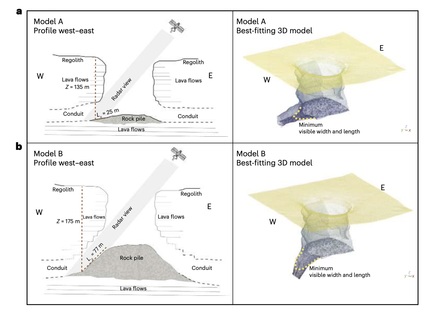 研究人员分析了来自月球勘测轨道飞行器的静海坑(Mare Tranquillitatis Pit)雷达数据——静海坑是月球上已知最深的坑,半径约为100米,有垂直坑壁或悬壁,坑底倾斜。他们观察到该坑西侧的雷达亮度上升,并利用雷达图像进行了模拟,发现这些观测结果能用存在一个从坑底西侧扩张的洞穴空隙或管道来解释。