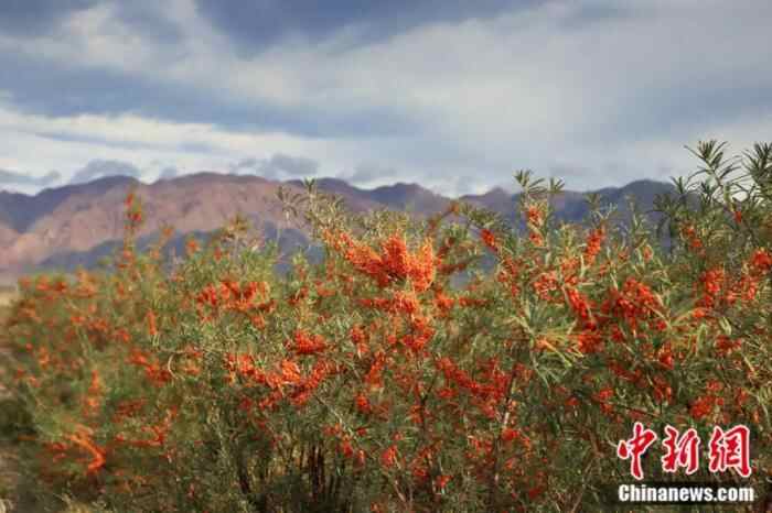 红黄绿交织的万亩沙棘林