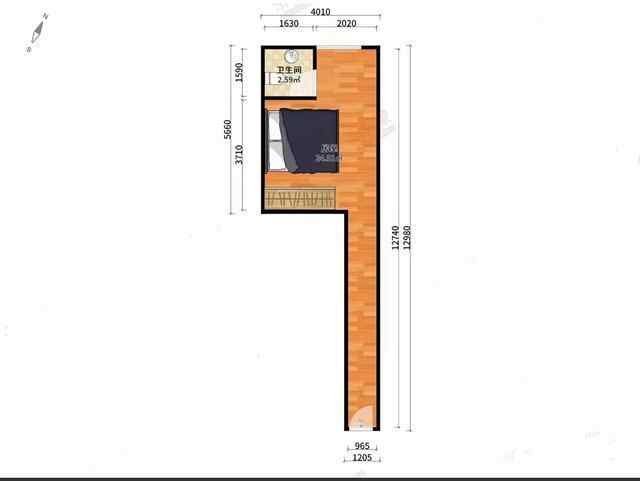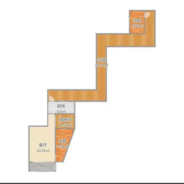 公开的户型图显示,房屋户型像恐龙,头部是卧室、过道和卫生间,身体是狭长的厨房,腿部是客厅和另一个卧室,尾巴部分是阳台。