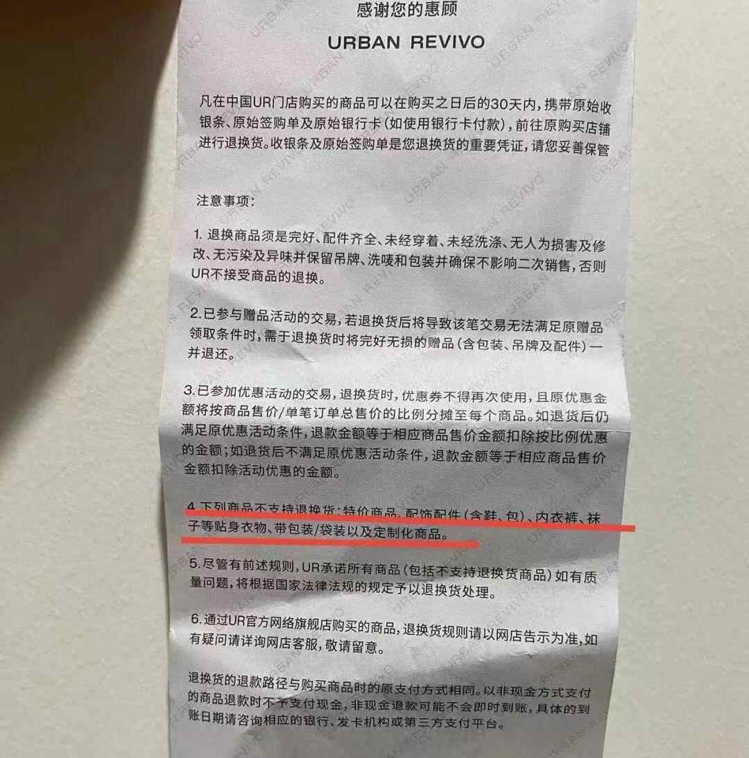 为了核实网友的反馈,记者前往广州市海珠区的一家UR店铺购买了一件打折连衣裙。在结账时,店员明确指出:“特价商品不退不换。”小票背面也清楚写明“下列商品不支持退换货:特价商品、配饰配件(含鞋、包)、内衣裤、袜子等贴身衣物、带包装/袋装以及定制化商品。”而正价商品在不影响二次销售的情况下可以退换。