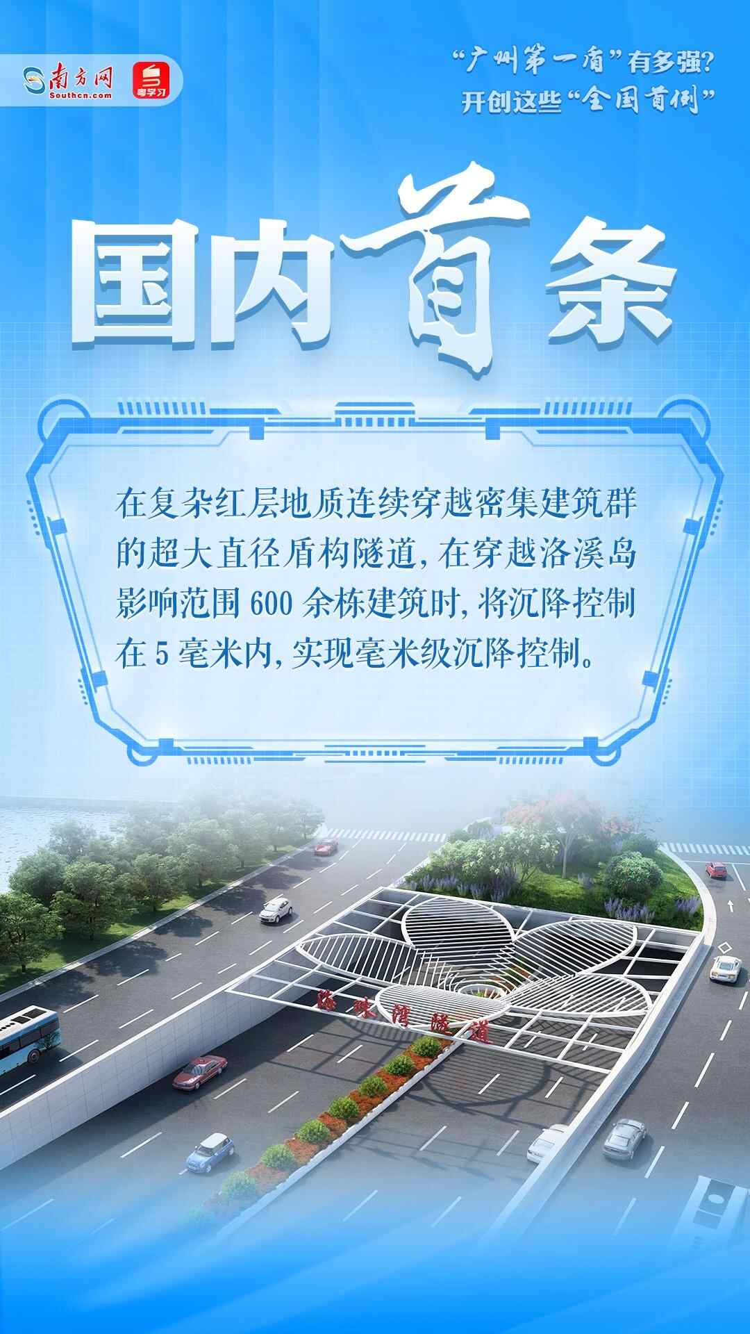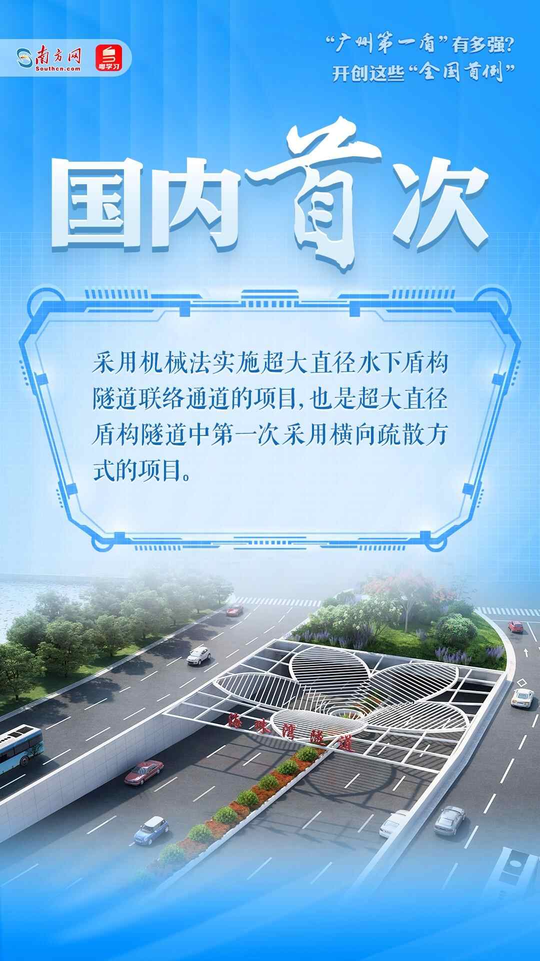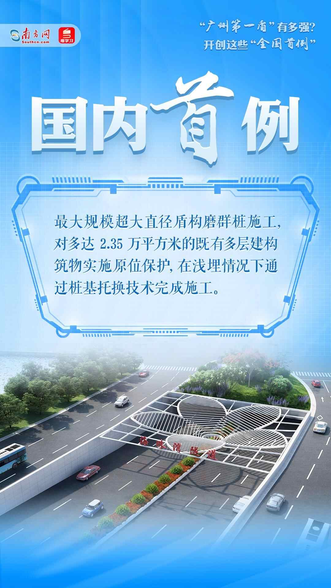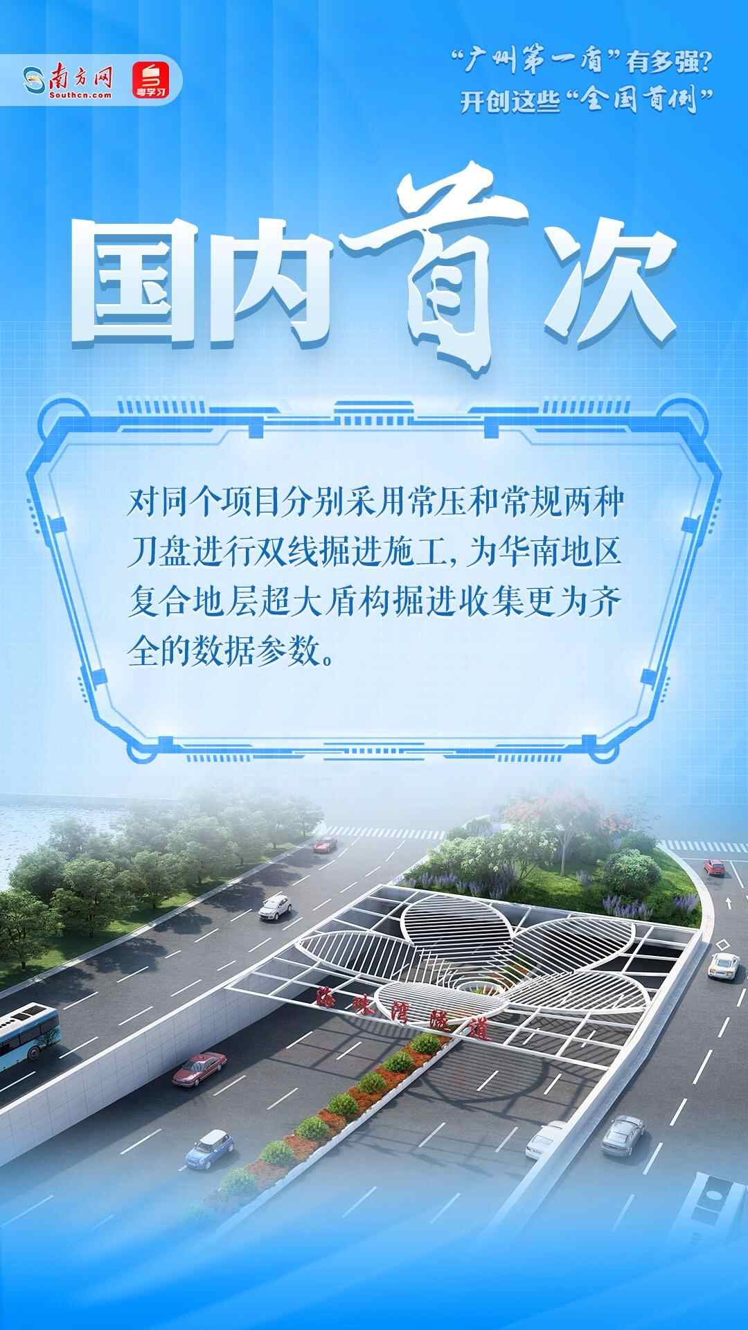 海珠湾隧道工程隧道段长3463米,其中盾构段长2102米,开挖直径达15.07米,采用盾构隧道的形式下穿密集建构筑物和珠江多个水道,是广州第一条超大直径盾构隧道,被称为“广州第一盾”。超大直径盾构叠加广州复杂地质条件,海珠湾隧道工程的施工为国内超大直径盾构施工“探路”,创下多项“全国首例”。