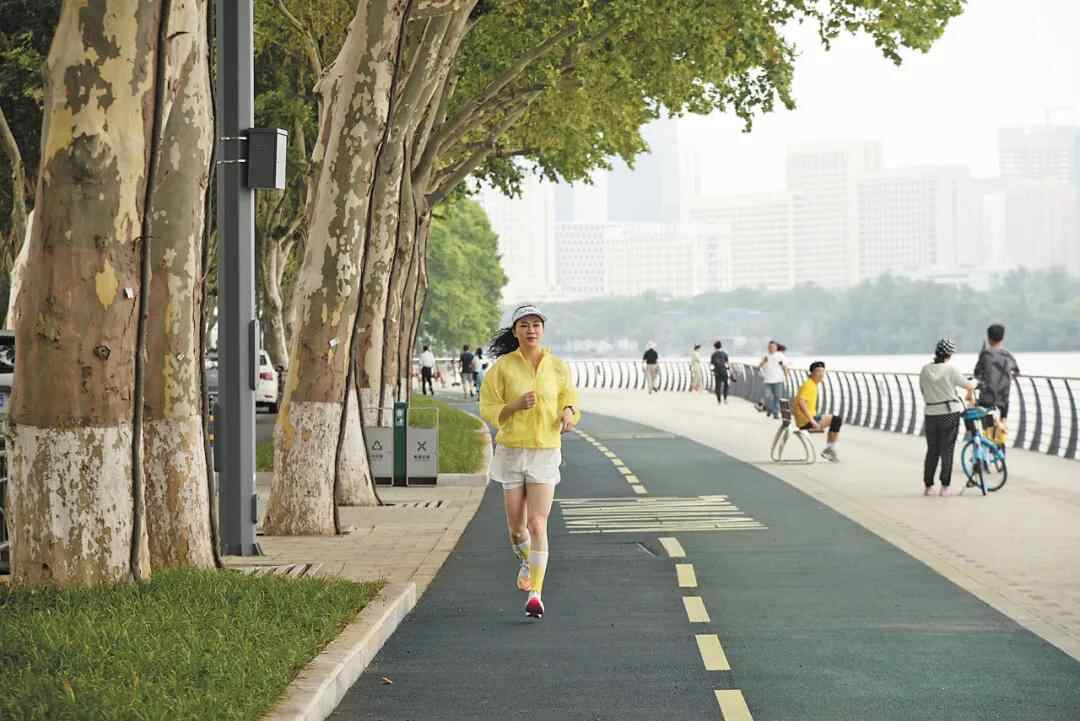 从驿站出发,何豆豆踏上一段6米宽的柏油路。路旁,高大的树木郁郁葱葱,繁茂的枝叶连接成片,犹如一个巨大的绿色弧顶,将绿道笼罩起来,空气中也带着清新的凉意。完成热身、调整呼吸,何豆豆轻点运动手表,开始跑步。一路上,骑行的青年、漫步的老人、拍照的游客散落在绿道各处,为如画风景增添灵动的色彩。