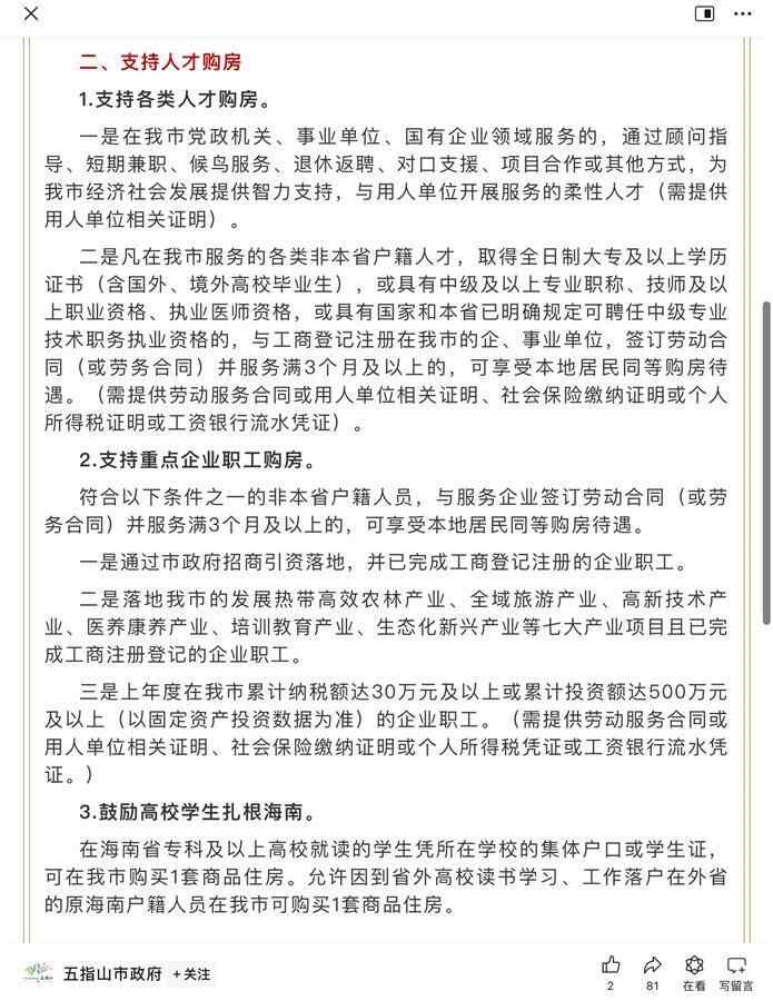 7月13日,五指山市住房和城乡建设局印发《关于进一步优化调整房地产调控政策的通知》,其中提到支持常住人口购房,支持人才购房,企业投资兴业,给予非海南户籍购房指标等多项政策。