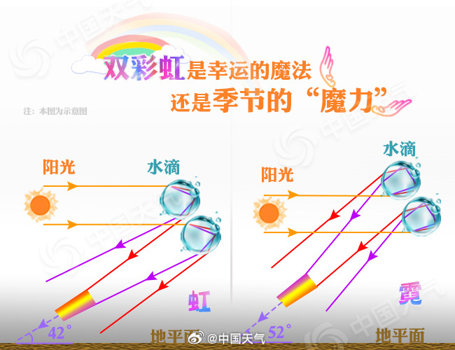 双彩虹是怎么出现的呢?其实,双彩虹一条叫虹,另一条叫霓。一般来说,当阳光经过水滴时,它会被折射-反射-折射出来,出现的就是常看到的单条彩虹。如果阳光经过折射-反射-反射-折射,多了一次反射过程,就是双彩虹。