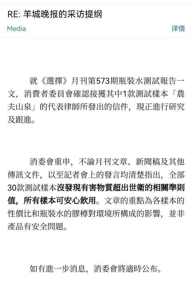 当天,香港消委会回复羊城晚报记者,该委员会确认收到农夫山泉的律师函,正进行研究及跟进,并重申,不论月刊文章、新闻稿及其他传讯文件,以及记者会上的发言均清楚指出,全部30款测试样本没发现有害物质超出世卫的相关准则值,所有样本可安心饮用。