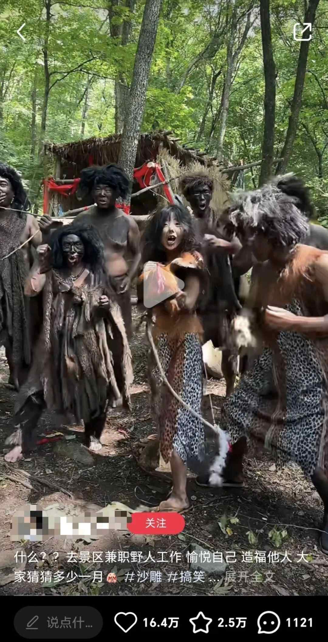 近日,有网友在社交平台分享去景区兼职“野人”的视频。视频中,6名装扮成野人的人用手反复拍打嘴唇,发出野人般“呜呜呜”的声音,并与游客进行各种互动。
