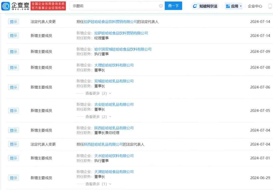 企查查APP显示,宗馥莉今年以来,接任杭州娃哈哈电子商务有限公司、浙江启力投资有限公司、杭州宏胜营销有限公司等20余家公司法定代表人职务,但随后又卸任其中贵阳娃哈哈昌盛饮料有限公司、贵阳娃哈哈食品有限公司等公司法定代表人职务。
