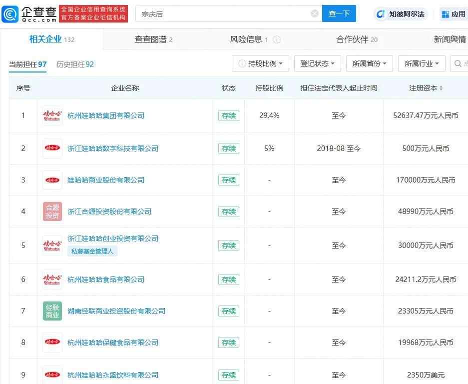 目前,宗庆后仍在97家公司担任法定代表人,其中包括杭州娃哈哈集团有限公司、浙江娃哈哈数字科技有限公司、娃哈哈商业股份有限公司、杭州娃哈哈食品有限公司等。