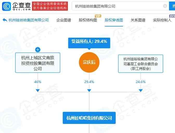 企查查APP显示,目前,杭州娃哈哈集团有限公司仍由宗庆后担任法定代表人并持股29.4%,该公司大股东为杭州上城区文商旅投资控股集团有限公司,持股46%,杭州娃哈哈集团有限公司基层工会联合委员会(职工持股会)对该公司持股24.6%。宗馥莉还未接手娃哈哈集团股份。