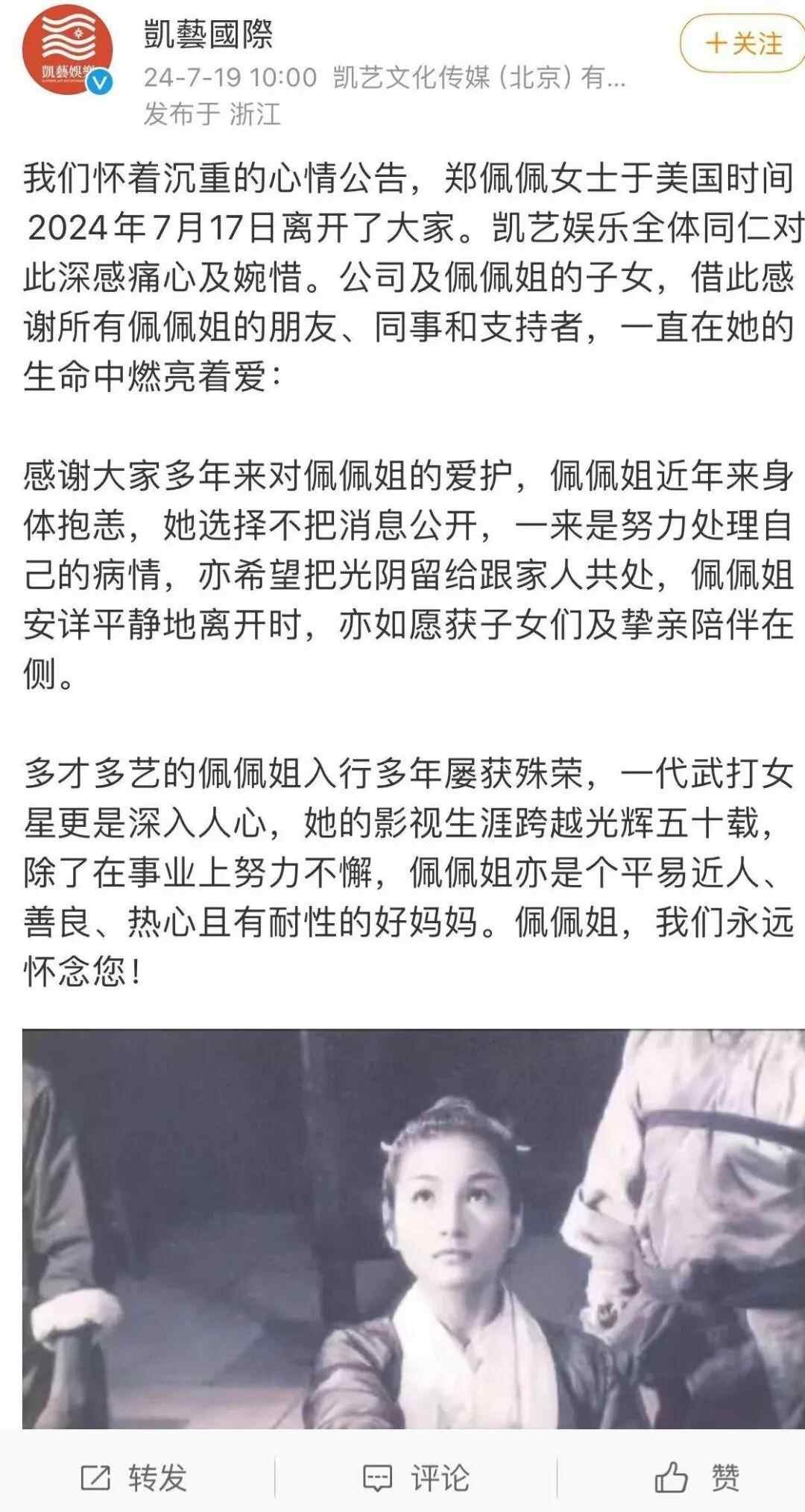 著名演员郑佩佩在7月17日于美国去世,享年78岁。郑佩佩经纪公司在讣告中称:“感谢大家多年来对佩佩姐的爱护,佩佩姐近年来身体抱恙,她选择不把消息公开,一来是努力处理自己的病情,亦希望把光阴留给跟家人共处,佩佩姐安详平静地离开时,亦如愿获子女们及挚亲陪伴在侧。多才多艺的佩佩姐入行多年屡获殊荣,一代武打女星更是深入人心,她的影视生涯跨越光辉五十载,除了在事业上努力不懈,佩佩姐亦是个平易近人、善良、热心且有耐性的好妈妈。佩佩姐,我们永远怀念您!”
