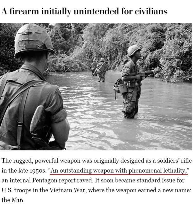 AR-15是上世纪50年代后期应美国军方对步枪“小口径、多携弹”的要求应运而生的。在上世纪60年代的越南战争中,AR-15成为美军标配,并被命名为人们熟知的M-16。五角大楼曾称赞它为“一种具有惊人杀伤力的杰出武器”。