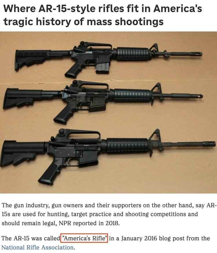 美国最大的枪支利益集团——全国步枪协会甚至公开将AR-15鼓吹为“美国步枪”。