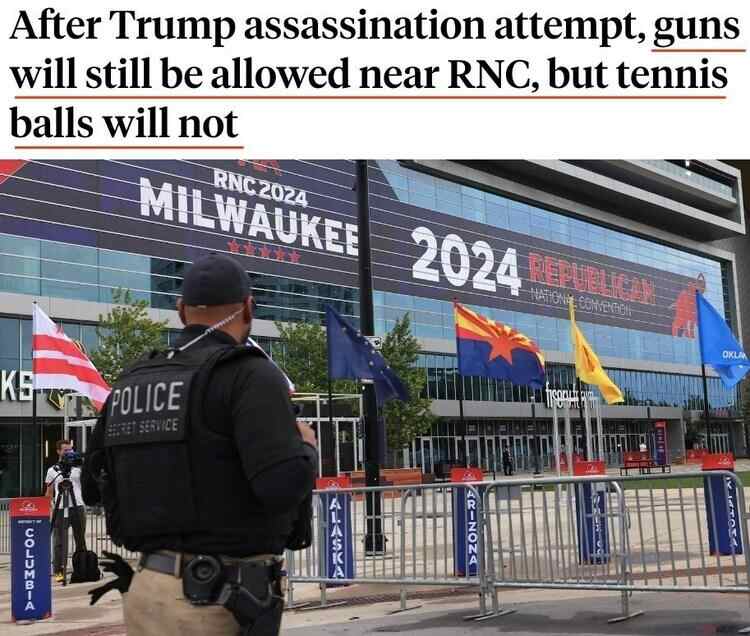荒谬的是,就在特朗普经历未遂刺杀后前往威斯康星州密尔沃基市参加共和党全国代表大会之际,会议举办地周围仍允许携带枪支,却不允许携带其他一些危险性小得多的东西,比如网球。