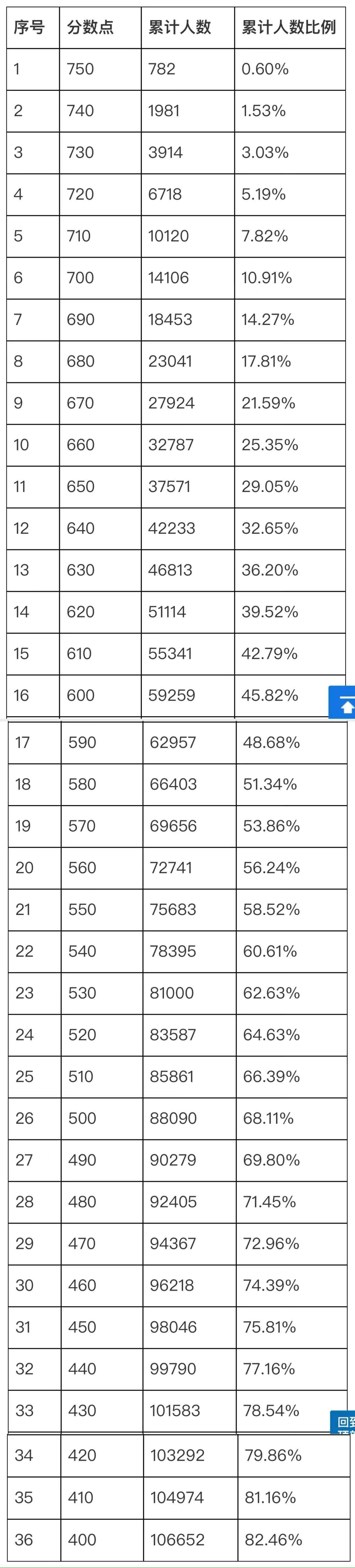 今年,710分以上的高分考生大幅减少。数据显示,710分以上考生是10120人,占比7.82%,而2023年是13505人、占比10.86%,减少3385人。其中,750以上的绝对高分考生2024年是782人、占比0.60%,而2023年是1392人、占比1.12%,减少610人;740分以上考生1981人、占比1.53%,2023年是3137人、占比2.52%,减少1156人;730分以上3914人、占比3.03%,2023年是5896人、占比4.74%,减少1982人;720分以上6718人、占比5.19%,2023年9436人、占比7.59%,减少2718人。