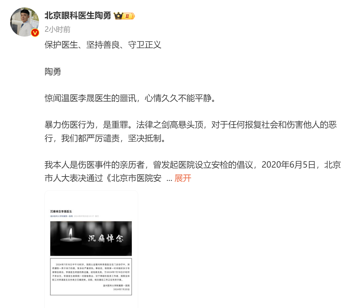 7月20日下午,2020年伤医事件受害者、北京朝阳医院眼科主任医师陶勇在微博上悼念因遭持刀伤害不治身亡的李晟医生。他在文中谴责暴力伤医行为,并提出医院应设立安检。全文如下: