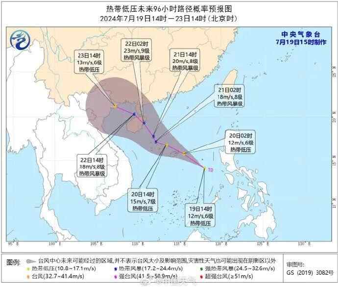 中央气象台7月20日15时对南海热带低压的路径和强度预报