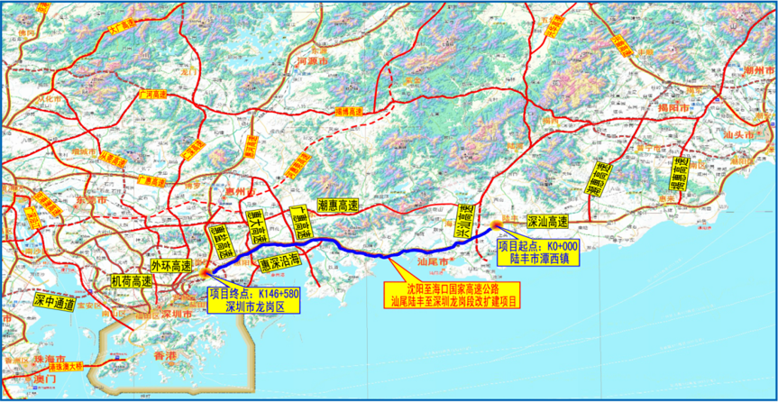 全长约146km,其中深汕段全长约18.48km,是目前深汕唯一一条直连深圳的高速、与深圳双城互动最主要的通道之一。