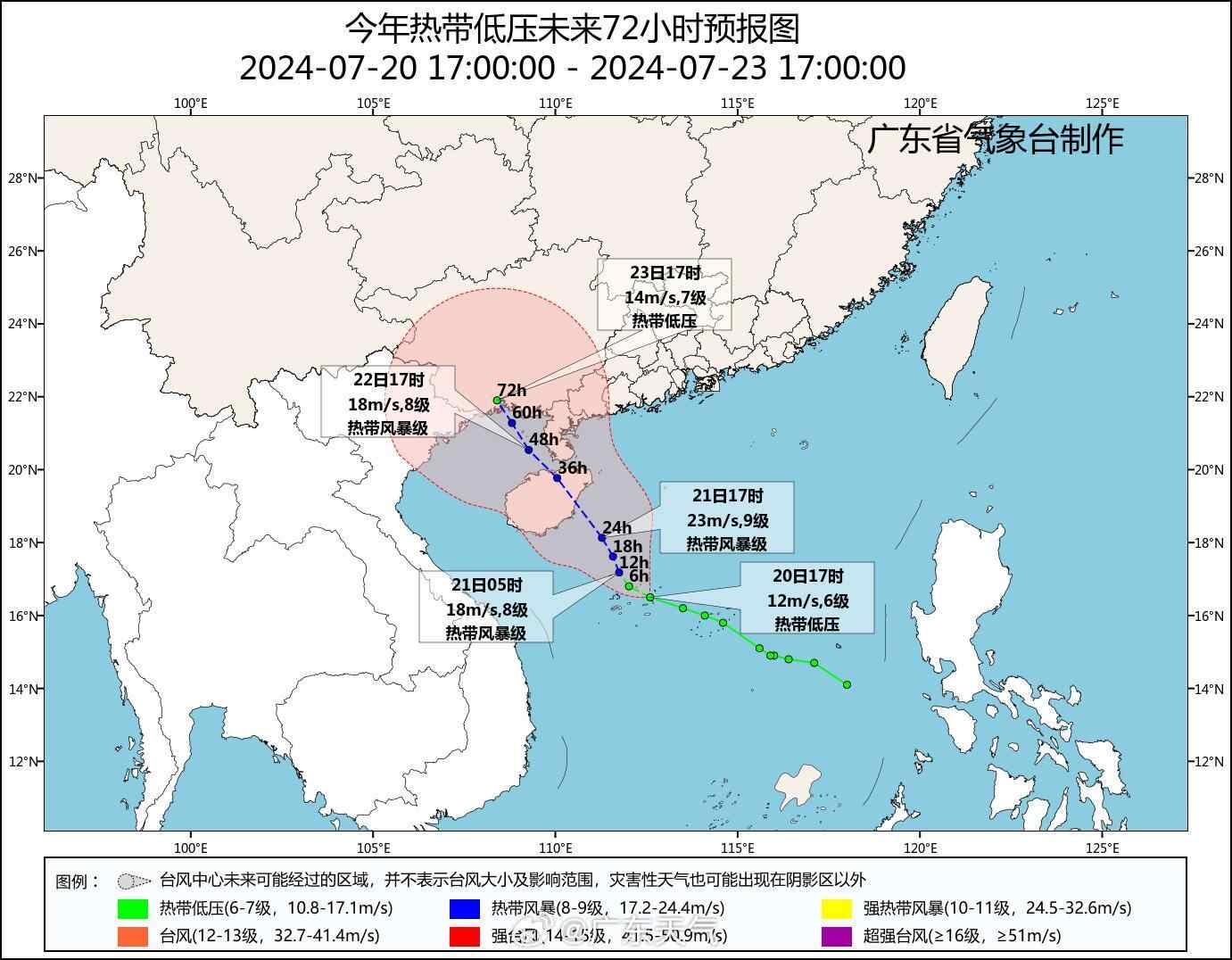 而20日夜间的预计则显示,热带低压可能在21日夜间在海南岛东部到广东西部一带沿海登陆,随后穿过海南岛,22日上午移入北部湾。