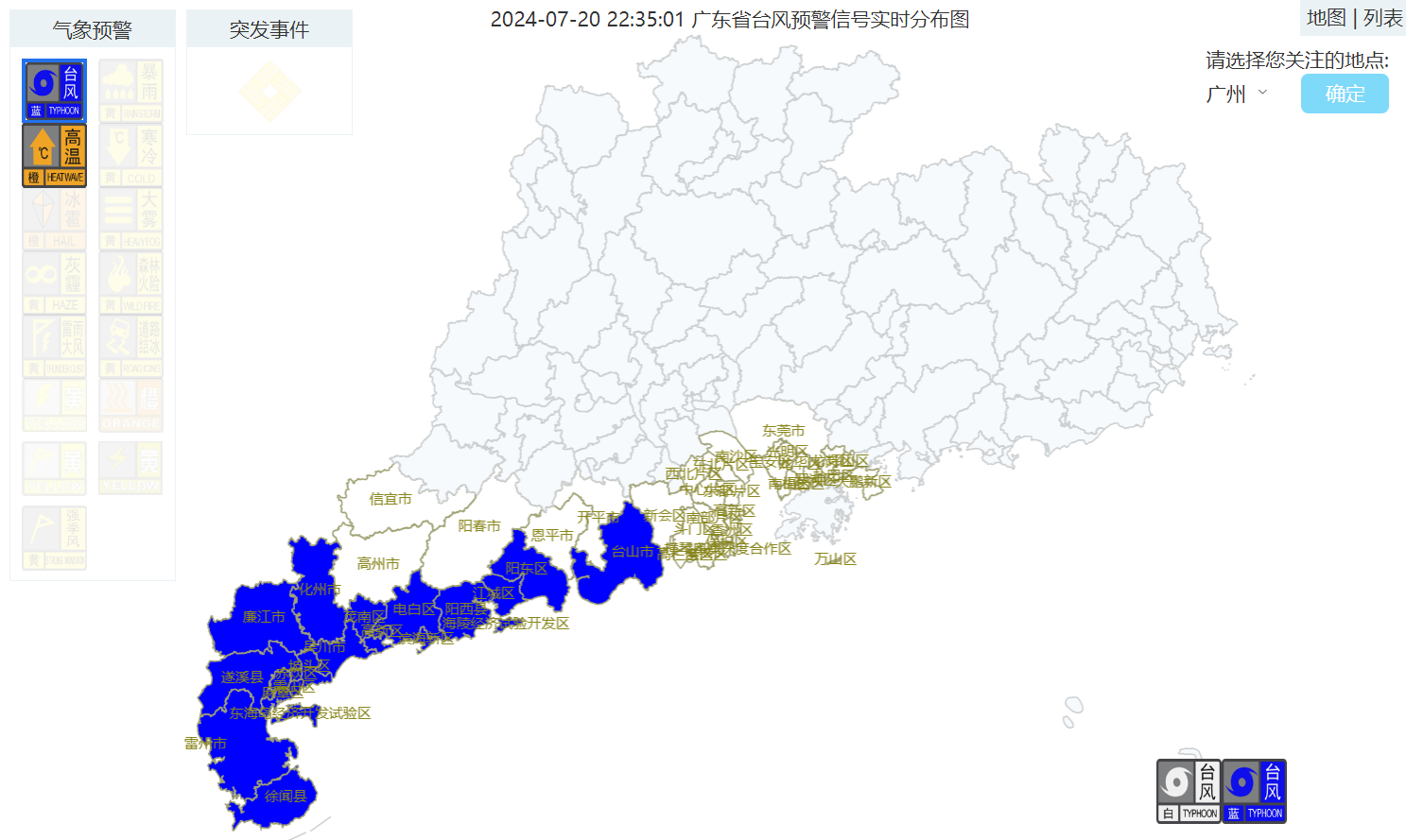 随着南海热带低压进一步移近,广东台风预警信号发布范围扩大,局地信号升级。从7月20日15时20分起,粤西沿海地区已陆续将台风白色预警信号升级至台风蓝色预警信号。