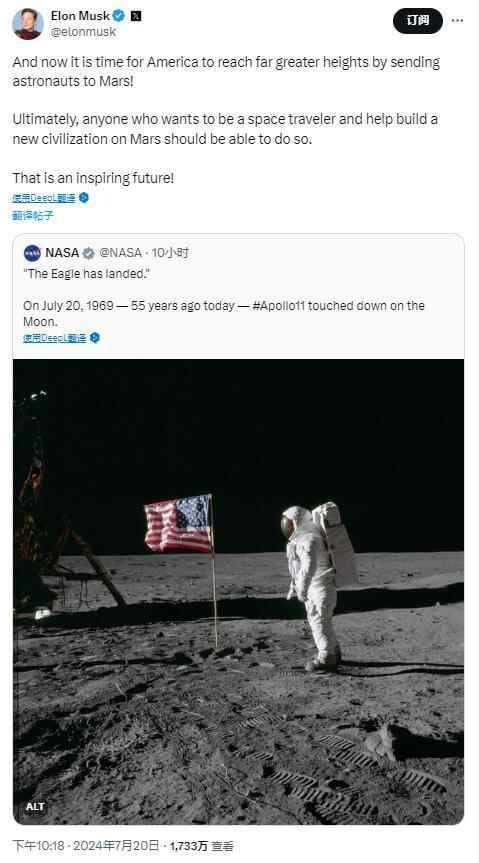 当地时间7月20日,美国企业家埃隆·马斯克发帖回复“阿波罗11号登月55周年”时表示,是时候把宇航员送上火星,来让美国达到新高度了。最终,任何想成为太空旅行者并帮助在火星上建立新文明的人都应该能够做到。“这是一个鼓舞人心的未来!”