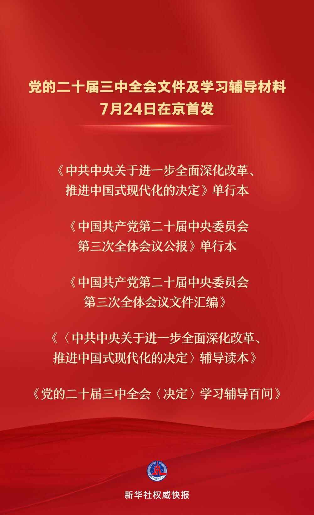 党的二十届三中全会文件及学习辅导材料7月24日在京首发