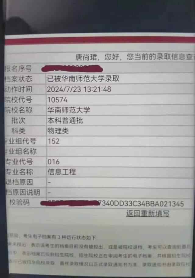 7月24日,第16次参加高考的@唐尚珺 发布视频称,已被华南师范大学信息工程专业录取。