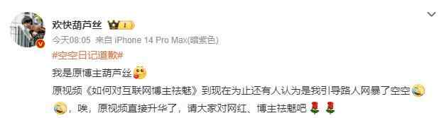 事件的起因是博主“欢快葫芦丝”发布了一条有关“如何对互联网博主祛魅”的视频,有一位网友在评论区说自己不喜欢博主“空空日记”,“空空日记”还在该评论下回复“我也不喜欢你”。