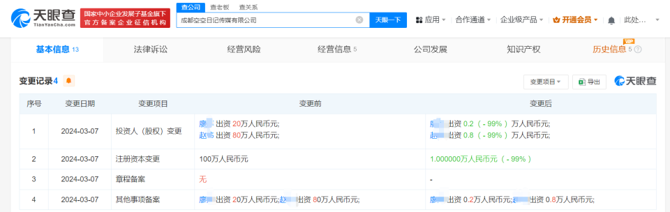 潇湘晨报记者从天眼查App获悉,“空空日记”关联公司成都空空日记传媒有限公司成立于2023年8月,法定代表人为赵某,注册资本1万人民币,经营范围含电影摄制服务、组织文化艺术交流活动、文艺创作、文化娱乐经纪人服务、互联网销售、票务代理服务等,由赵某、廖某分别持股80%、20%。