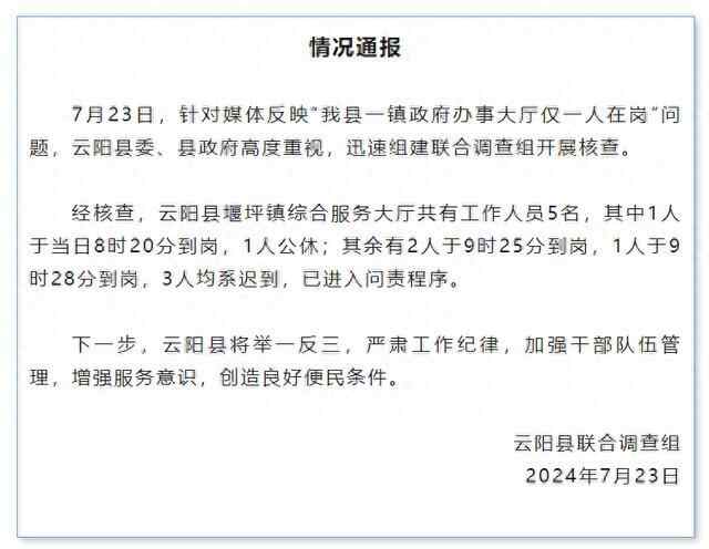 通报称,7月23日,针对媒体反映“我县一镇政府办事大厅仅一人在岗”问题,云阳县委、县政府高度重视,迅速组建联合调查组开展核查。