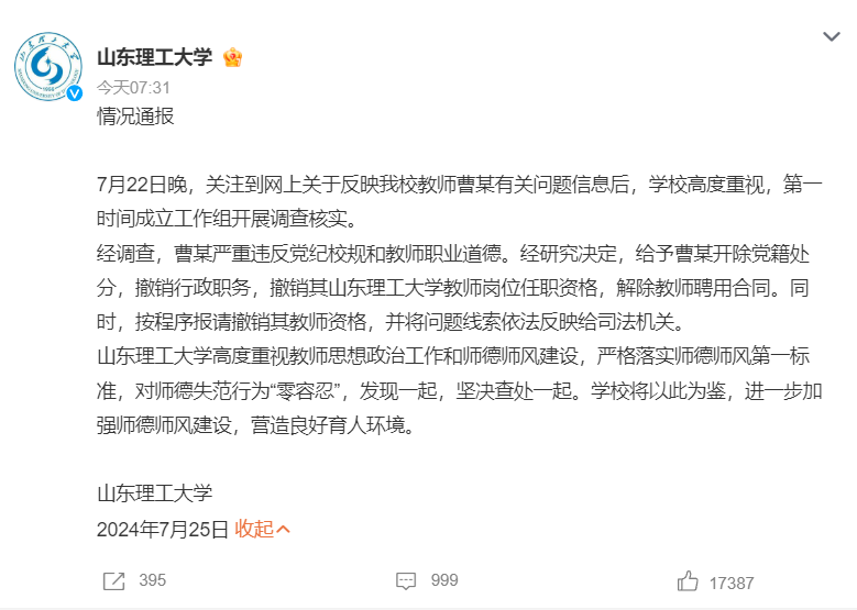 7月25日,山东理工大学发布情况通报。全文如下: