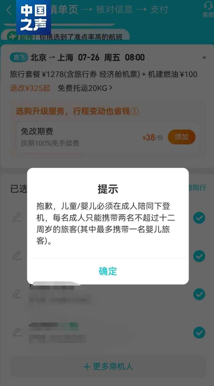 记者在某在线票务平台机票预订页面添加1名成人旅客和3名儿童时,平台跳出了“每名成人只能携带两名不超过十二周岁的旅客(其中最多携带一名婴儿旅客)”的弹窗提示。而这趟航班由国航运营,按照规定,可以携带3名5岁以下儿童乘机。