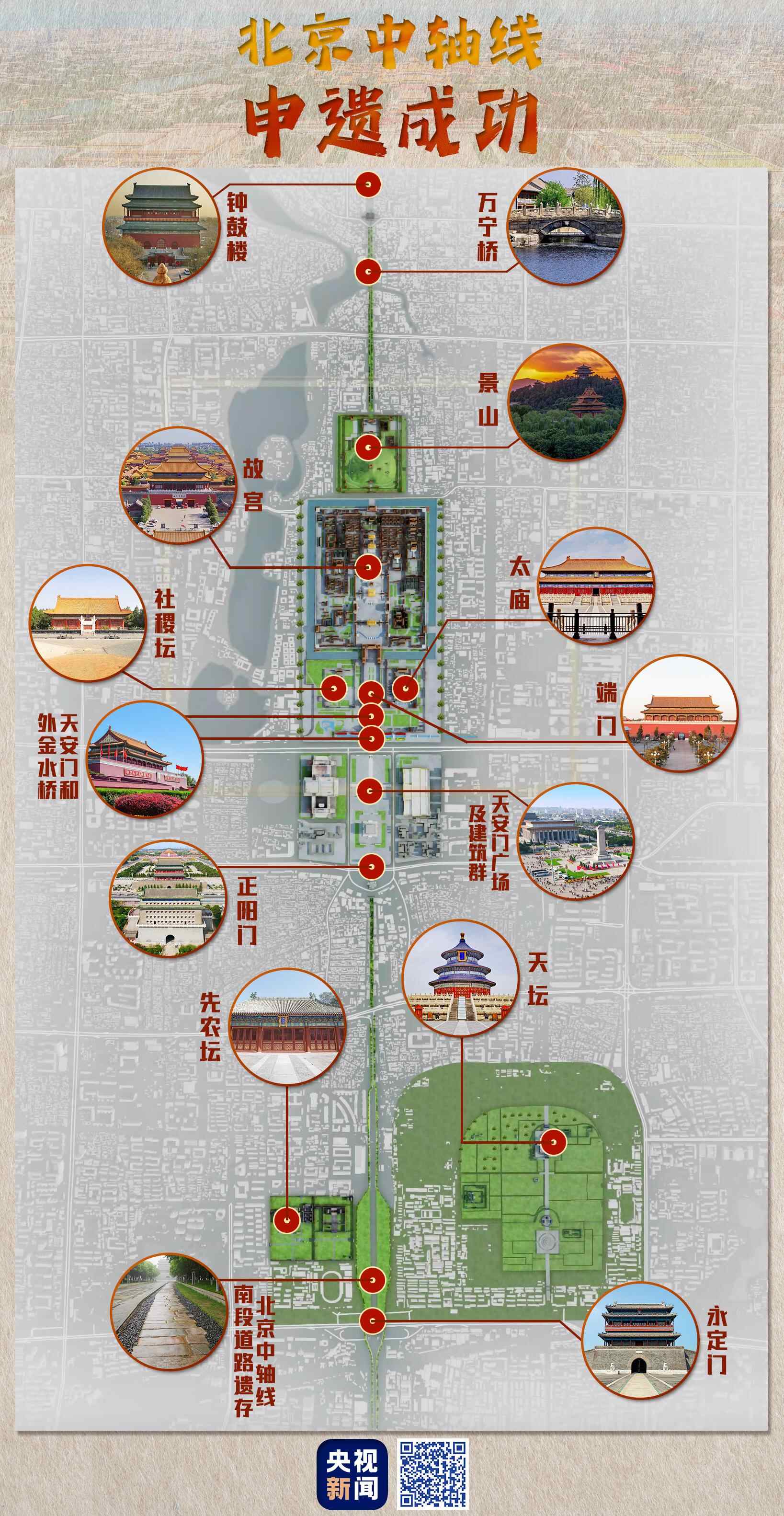 北京中轴线位于北京老城中心,全长7.8公里,始建于13世纪,是统领整个老城规划格局的建筑与遗址的组合体。北京中轴线共包含15处遗产构成要素。北起钟鼓楼,一路向南经万宁桥、景山、故宫、端门、天安门、外金水桥、天安门广场及建筑群、正阳门、中轴线南段道路遗存,至南端的永定门。太庙和社稷坛、天坛和先农坛分列中轴线东西两侧。这些遗产构成要素涵盖了古代皇家宫苑建筑、古代皇家祭祀建筑、古代城市管理设施、国家礼仪和公共建筑、居中道路遗存五种不同类型的历史遗存,形成了前后起伏、左右均衡对称的景观韵律与壮美秩序,是中国传统都城中轴线发展至成熟阶段的典范之作。