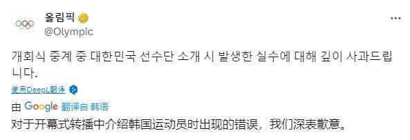 对此,国际奥委会在韩语官方账号致歉称,对在开幕式中介绍韩国运动员时出现的失误表示诚挚歉意。不过韩媒注意到,截至目前,国际奥委会尚未在其英文账号上发布道歉声明。