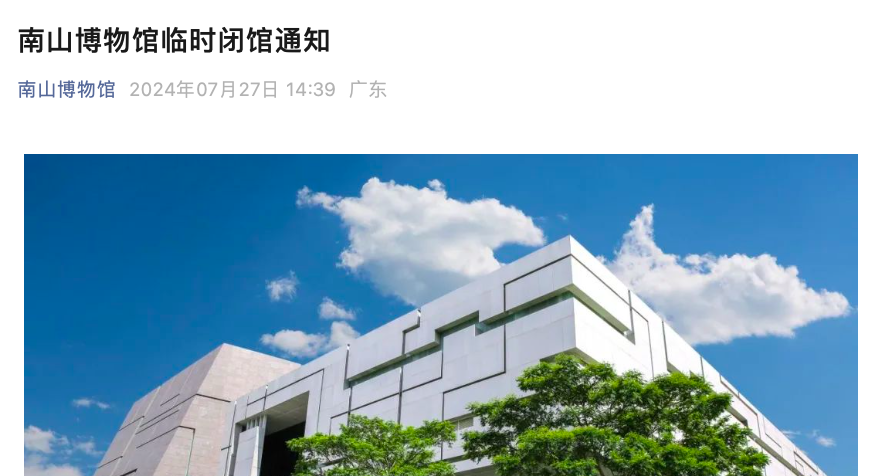 此外,南山博物馆发布临时闭馆通知称,受“格美”台风槽和西南季风共同影响,依据防汛应急响应要求,为确保广大市民的生命财产安全,南山博物馆、南头古城博物馆、陈郁故居、天后博物馆、宋少帝陵和南头古城微型博物馆群,今天暂停对外开放。若防汛应急响应下降或取消,将自动恢复开放。目前在馆参观的观众,仍可正常参观。