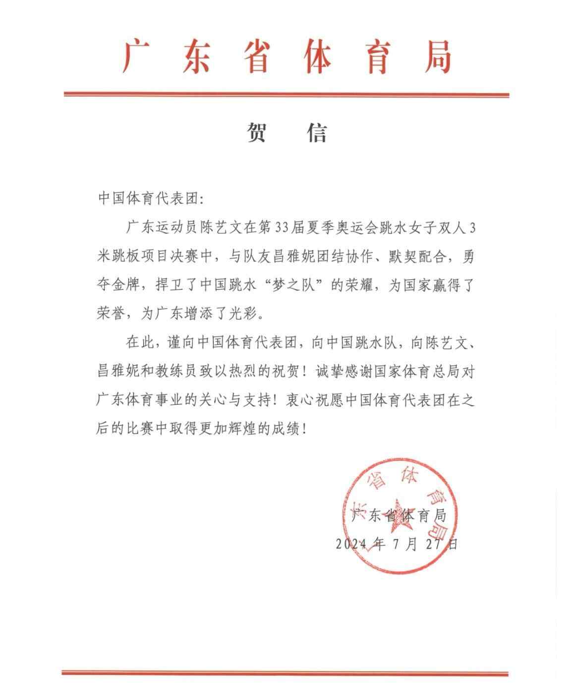 贺信中指出,广东运动员陈艺文在第33届夏季奥运会跳水女子双人3米跳板项目决赛中,与队友昌雅妮团结协作、默契配合,勇夺金牌,捍卫了中国跳水“梦之队”的荣耀,为国家赢得了荣誉,为广东增添了光彩。