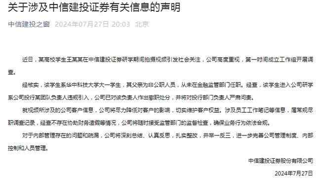 近日,某高校学生王某某在中信建投证券研学期间拍摄视频引发社会关注,公司高度重视,第一时间成立工作组开展调查。