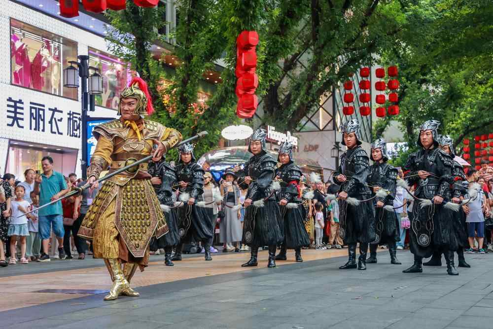 “我是岭南人、举家事朝君、忠义筑铁骨、策马踏浮云、一生巾帼志……”随着一段柔美动听的念白,国家一级演员、文华表演奖、中国戏剧梅花奖获得者曾小敏在人群中闪现,引起了一阵热烈欢呼,讲述巾帼英雄冼夫人的传奇。来自广东粤剧院的黄春强、张昊然、苏临轩等粤剧老师和8名手持弓箭盾牌的演员带来了气势如虹的弓箭舞,再现《谯国夫人》精彩片段。部分游客也一起加入快闪行列,将现场气氛推向高潮。