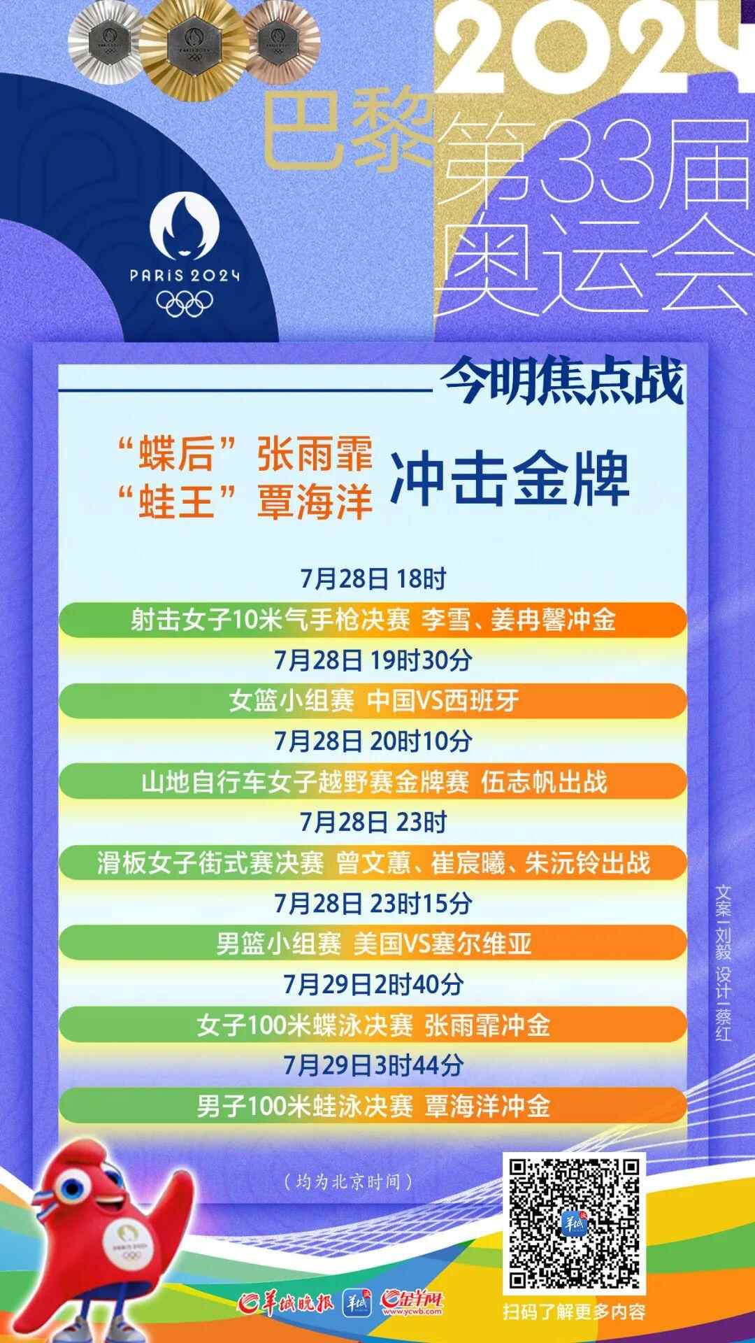 2时30分开始的游泳比赛将产生3枚金牌,包括女子100米蝶泳和男子100米蛙泳项目。中国选手张雨霏在女子100米蝶泳、覃海洋在男子100米蛙泳项目中均有冲击最高领奖台的实力。