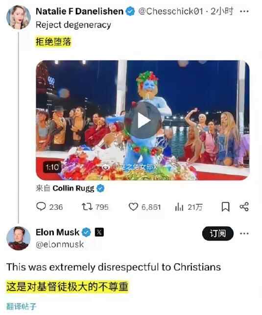 马斯克看完视频,也在油管上表达不满:“这是对基督徒极大的不尊重。”